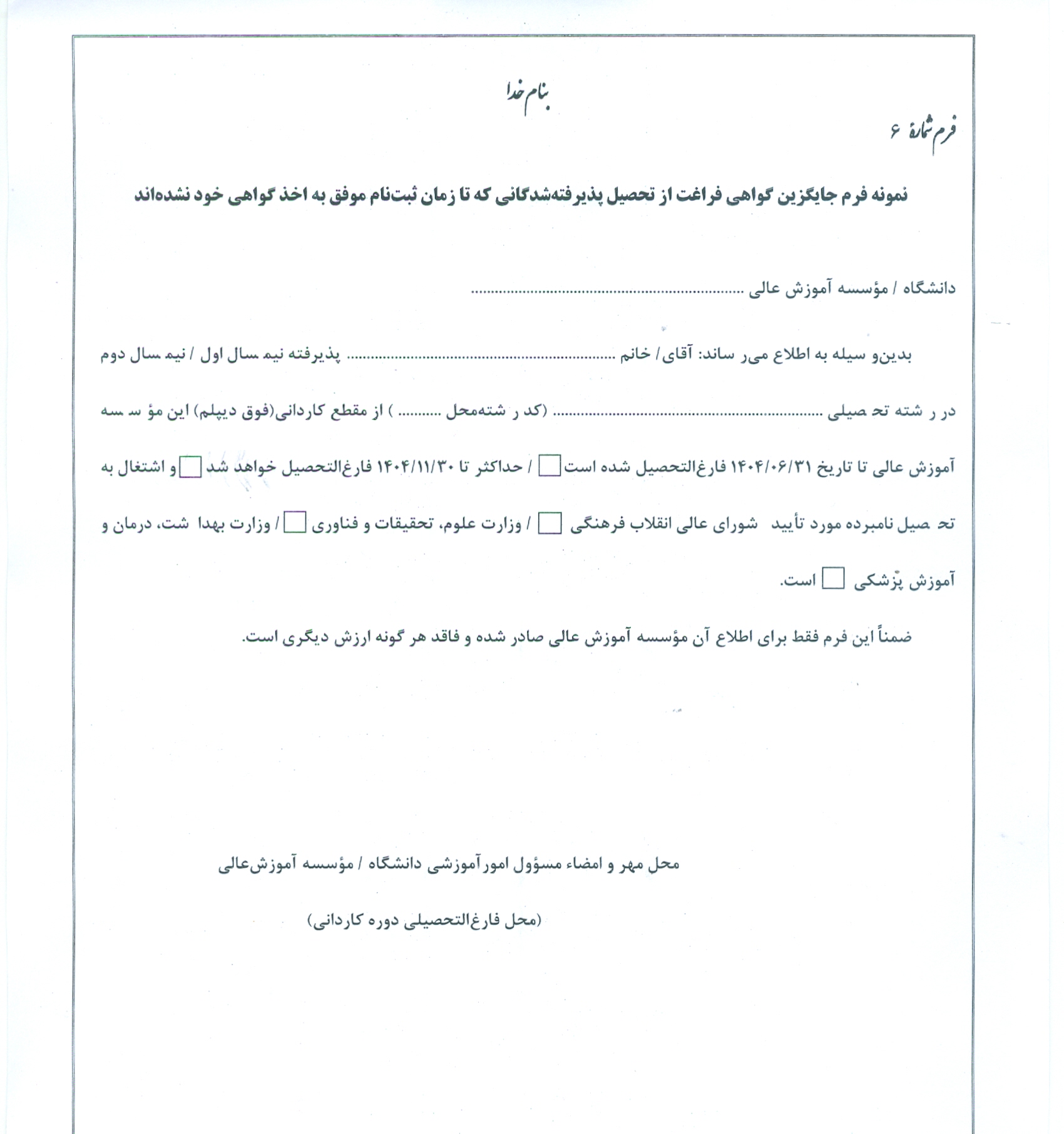 آن دسته از پذیرفته شدگانی که ارائه اصل یا گواهی مدرک کاردانی امکان پذیر نباشد، لازم است اصل گواهی تأیید شده توسط دانشگاه یا موسسه آموزش عالی محل اخذ مدرک کاردانی با محتوای فرم شماره 6 را ارائه نمایند .