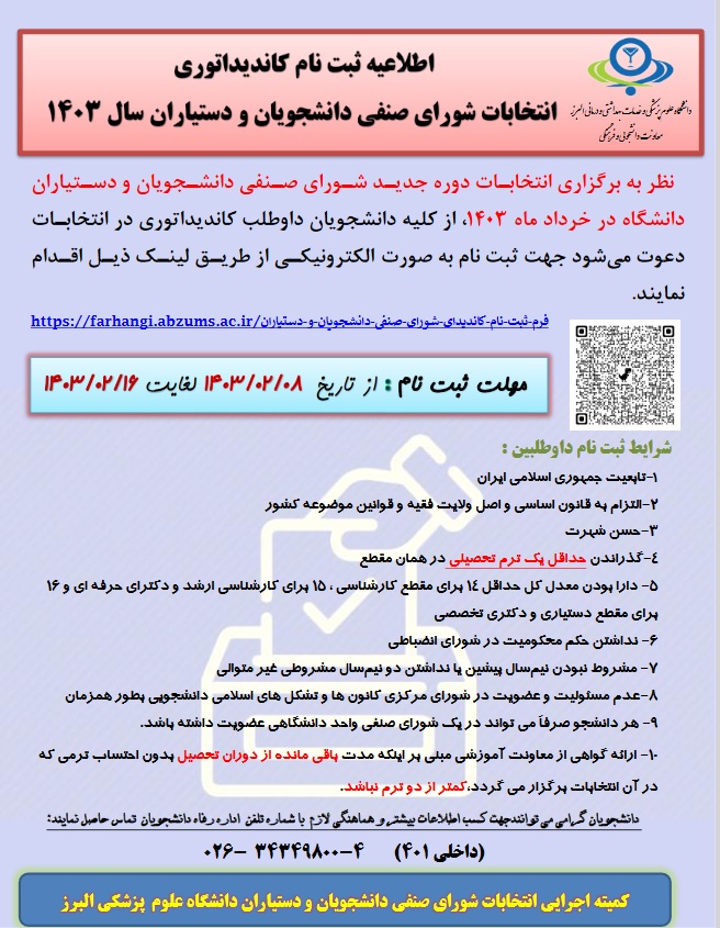 اطلاعیه ثبت نام انتخابات شورای صنفی دانشجویان و دستیاران سال 1403