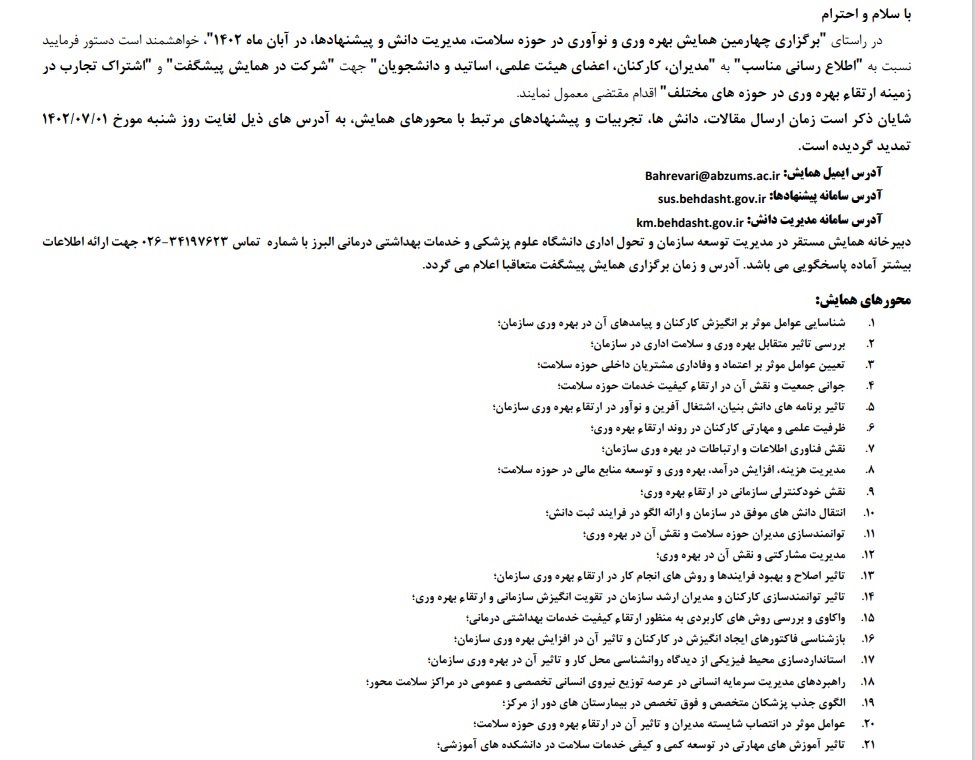 زمان ارسال مقالات، دانش ها ، تجربیات ، پیشنهادات جهت شرکت در چهارمین همایش بهره وری تا یکم مهر ماه تمدیدشد