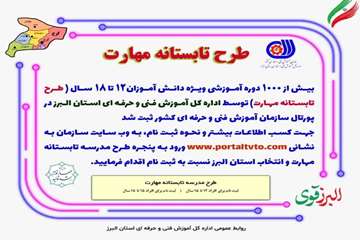 به گزارش روابط عمومی و بر اساس اطلاعیه اداره کل آموزش فنی و حرفه ای استان البرز به اطلاع می رساند ، طرح رایگان تابستانه مهارت ویژه دانش آموزان 12 تا 18 سال برگزار می شود>