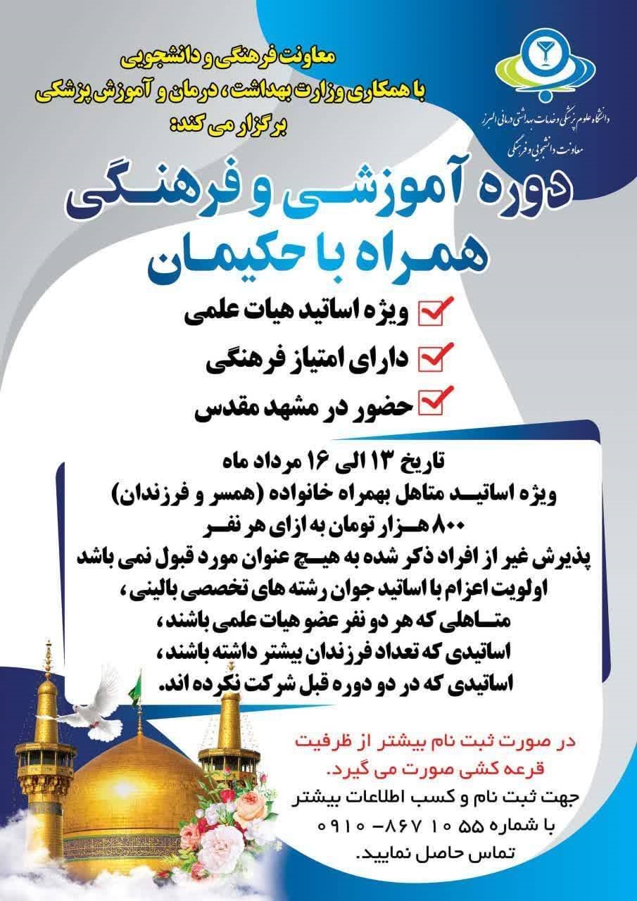 فراخوان ثبت نام در دوره همراه با حکیمان ویژه اساتید هیات علمی دانشگاهمعاونت فرهنگی و دانشجویی با همکاری وزارت بهداشت سومین دوره آموزشی فرهنگی همراه با حکیمان در مشهد مقدس برگزار می کند.