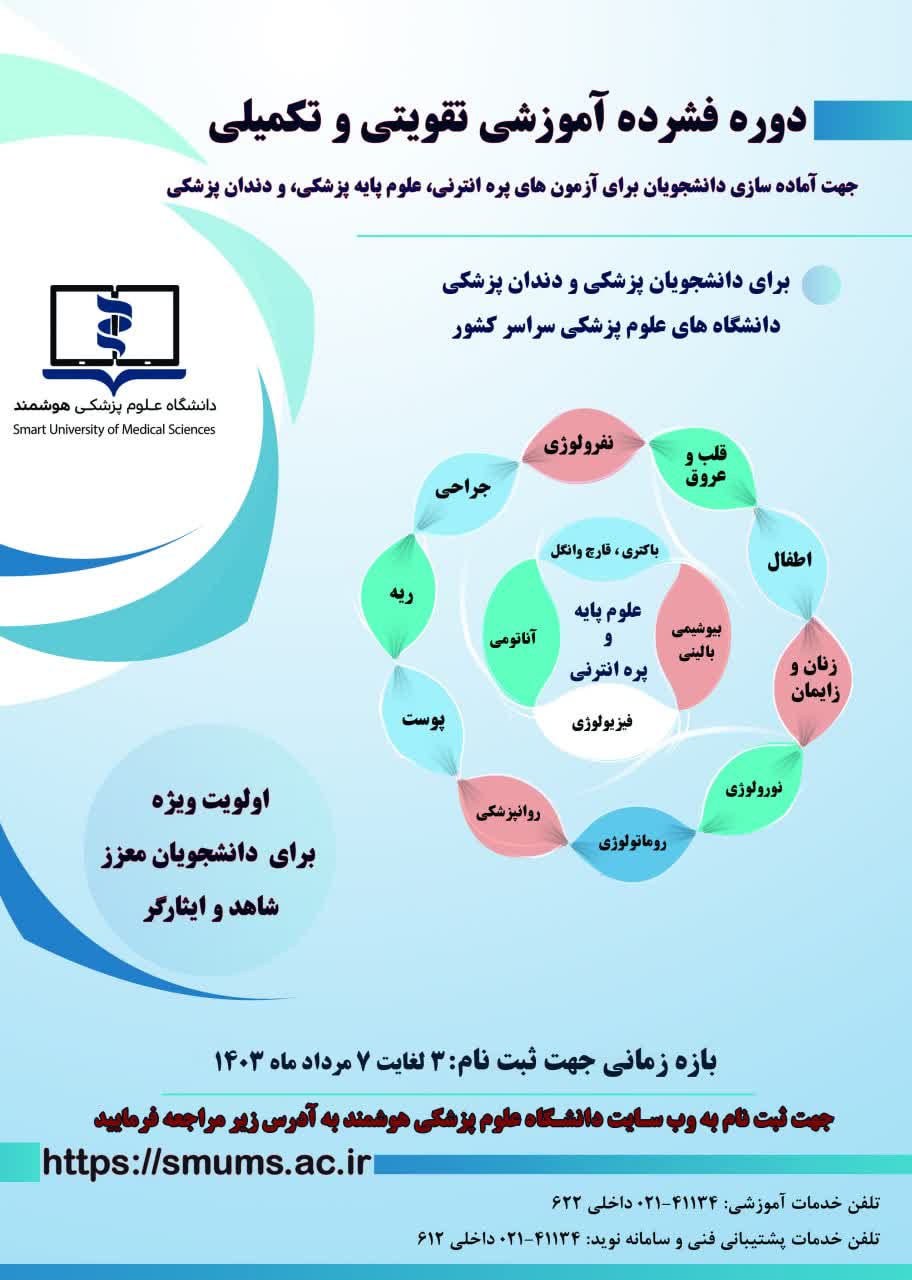 به اطلاع دانشجویان محترم رشته های دکتری عمومی پزشکی و دندان پزشکی دانشگاه های علوم پزشکی سراسر کشور می رساند، دانشگاه علوم پزشکی هوشمند با مجوز صادره از معاونت آموزشی وزارت بهداشت، درمان و آموزش پزشکی و به درخواست ستاد شاهد و ایثارگر وزارت متبوع "دوره فشرده آموزشی تقویتی-تکمیلی جهت آماده سازی دانشجویان برای آزمون های علوم پایه پزشکی، دندان پزشکی و پره انترنی" را برگزار می نماید.
