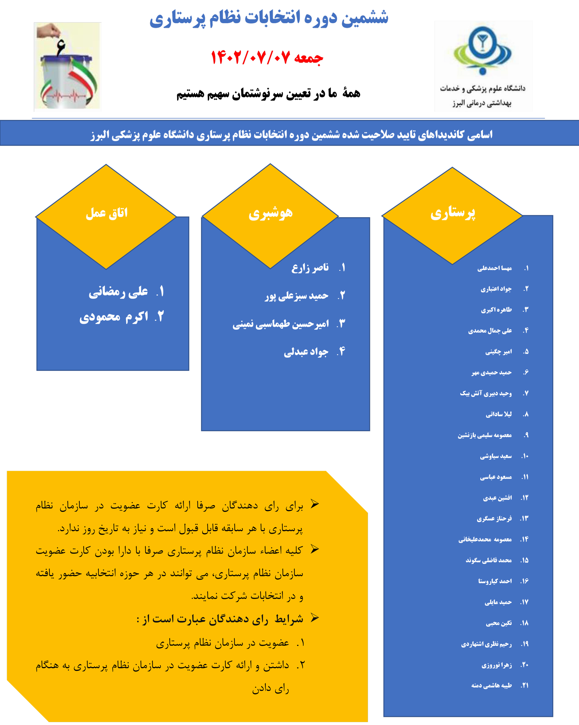 نامزد های انتخاباتی تایید صلاحیت شده ششمین دوره انتخابات نظام پرستاری البرز اعلام شد