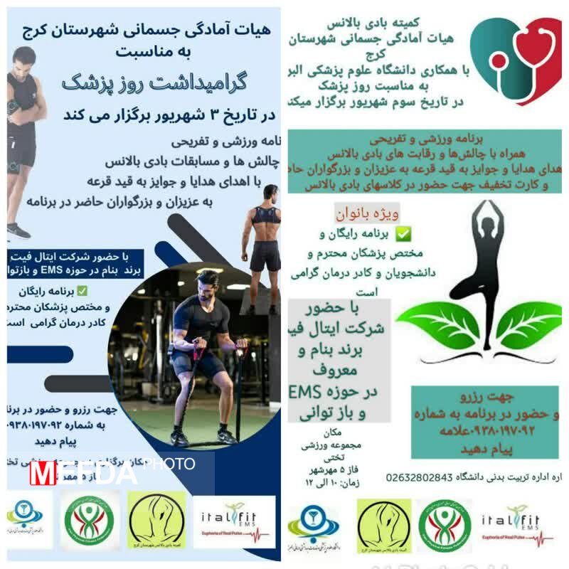 به مناسبت روز پزشک کمیته های ورزش های همگانی اداره کل ورزش و جوانان استان البرز با حضور هیئت های ورزشی و با همکاری اداره تربیت بدنی دانشگاه علوم پزشکی البرز و کمیته بادی بالانس و ایتال فیت روز جمعه ۳ شهریورماه ۱۴۰۲ همایش سراسری ویژه کلیه دانشجویان ، پرستاران-، کادر درمان ، پزشکان و کارمندان استان برگزار می کند.