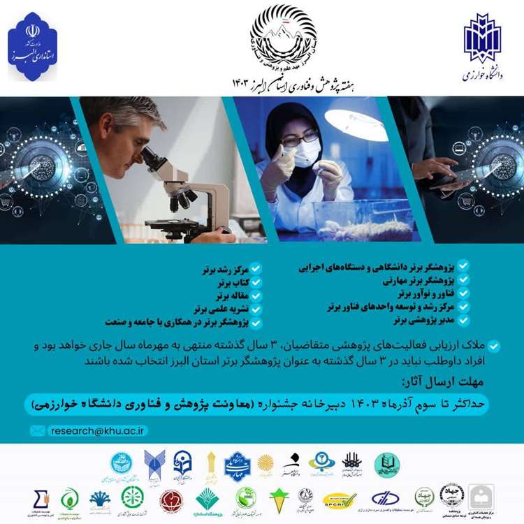 پیرو برگزاری جلسه نخست شورای علمی جشنواره برگزیدگان هفته پژوهش و فناوری استان البرز و تدوین و تصویب شیوه‌نامه‌های برگزیدگان استان در سال ۱۴۰۳، دانشگاه‌ها، پژوهشگاه‌ها وموسسات تحقیقاتی استان البرز اسامی، شماره تماس و کد ملی پژوهشگران محترم آن سازمان که داوطلب و حائز شرایط مندرج در شیوه‌نامه‌های پیوست هستند، حداکثر تا سوم آذرماه به دبیرخانه جشنواره (معاونت پژوهش و فناوری دانشگاه خوارزمی) اعلام نمایند.