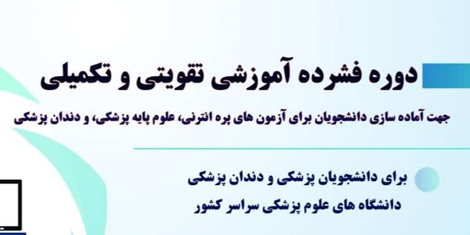 به اطلاع دانشجویان محترم رشته های دکتری عمومی پزشکی و دندان پزشکی دانشگاه های علوم پزشکی سراسر کشور می رساند، دانشگاه علوم پزشکی هوشمند با مجوز صادره از معاونت آموزشی وزارت بهداشت، درمان و آموزش پزشکی و به درخواست ستاد شاهد و ایثارگر وزارت متبوع "دوره فشرده آموزشی تقویتی-تکمیلی جهت آماده سازی دانشجویان برای آزمون های علوم پایه پزشکی، دندان پزشکی و پره انترنی" را برگزار می نماید.