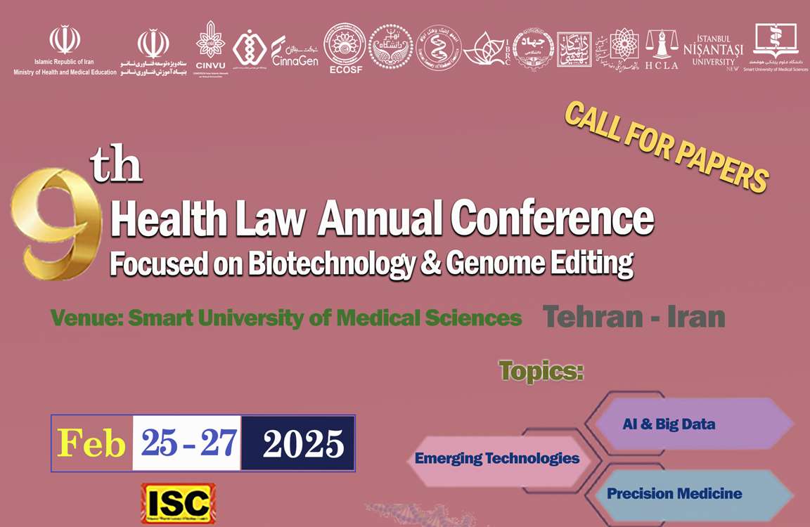 نهمین همایش سالیانه حقوق سلامت با تاکید بر بیوتکنولوژی و ویرایش ژنوم (۹th Health Law Annual Conference on Biotechnology and Genome Editing) در تاریخ ۷ تا ۹ اسفندماه ۱۴۰۳، برابر با ۲۸ تا ۲۷ فوریه ۲۰۲۵ از ساعت ۰۸:۳۰ در سالن کنفرانس دانشگاه علوم پزشکی هوشمند برگزار می شود.